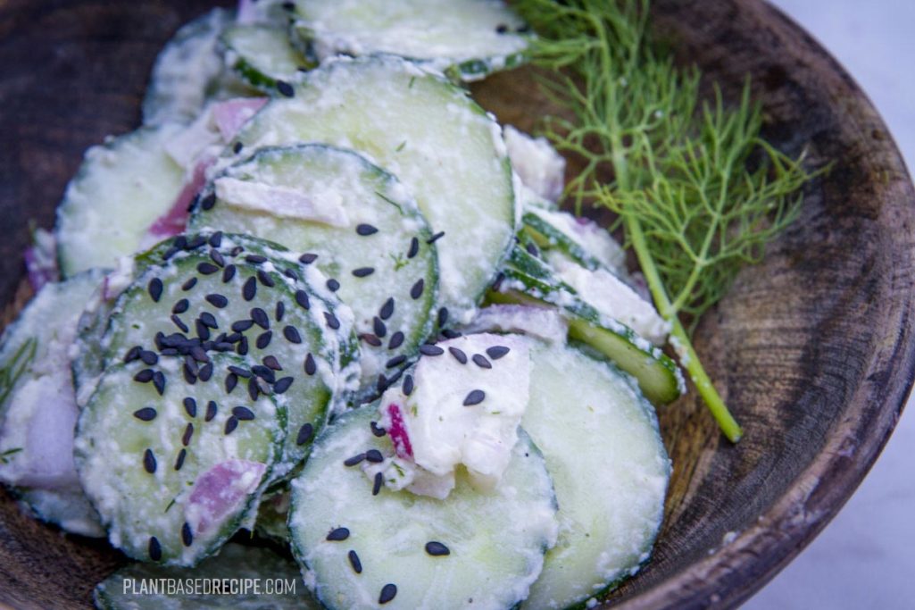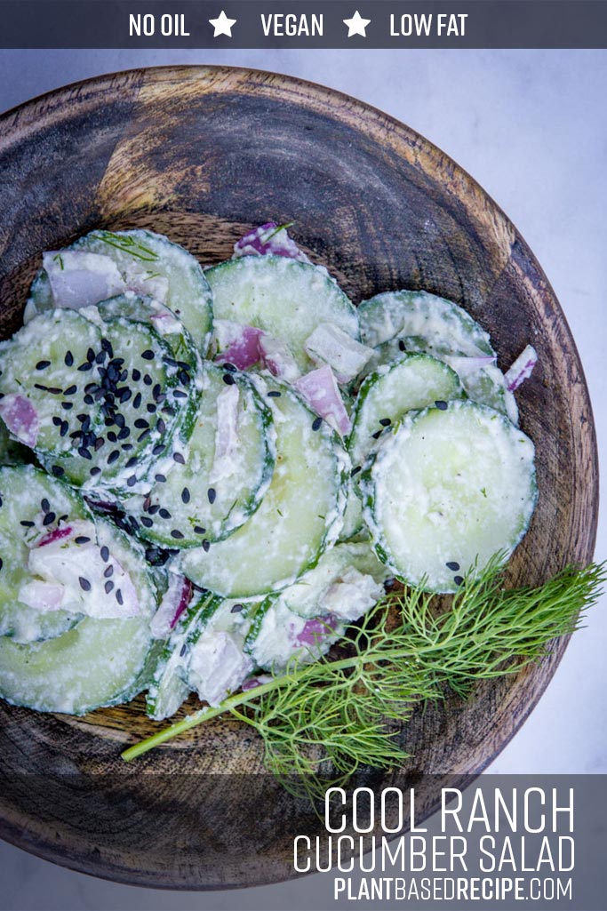 Quick and easy salads are perfect at the end of a long day. This ranch and cucumber salad is one of those where you can make a tasty and healthy salad in minutes, and have it on the dinner table before you know it. You only need three ingredients: cucumbers, onions, and ranch dressing. This recipe includes a link to our oil-free cool ranch dressing (a twist on classic ranch using dill), but you can of course use a vegan ranch dressing from the store, or sub parsley for dill in our recipe.
