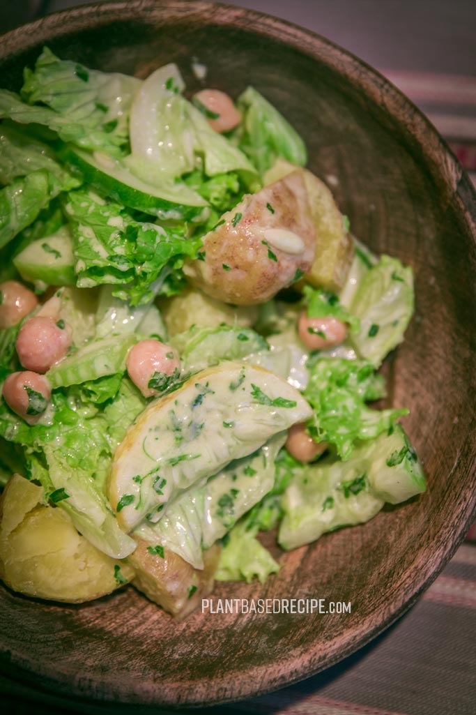 I love “meal” sized salads that carry enough punch they fill you up and let you feel satisfied. This vegan and oil-free salad fits the bill. It has a bunch of potato and chickpeas added to add a bunch of fiber, starch, and protein to fill your stomach and leave you satiated at the end of the meal. The dressing is what makes it though. The tahini and nutritional yeast both add a bit of creaminess and nuttiness to the dressing and the apple cider vinegar balances it out nicely with a bit of acid. And it seems to pair perfectly with the potatoes and chickpeas. Whole food plant based does not need to be boring or drab. You won’t miss a thing eating this salad, it’s inexpensive if you’re on a budget, and you can make it for the whole family in a half hour or less.