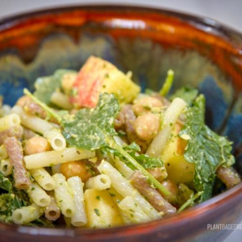 If you are searching for a refreshing and easy dish to take to a summertime party, look no further. Lunch, dinner, side dish – this one works. It’s filling, healthy, and doesn’t include any oil or significant source of fat. This oil-free pesto pasta salad includes greens, chickpeas, and even apple to create a balanced and healthful meal or side. It’s easy to adjust to whatever you have on hand, too. No arugula? Use kale. No chickpeas? Toss in some white beans or English peas.