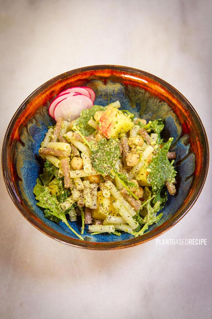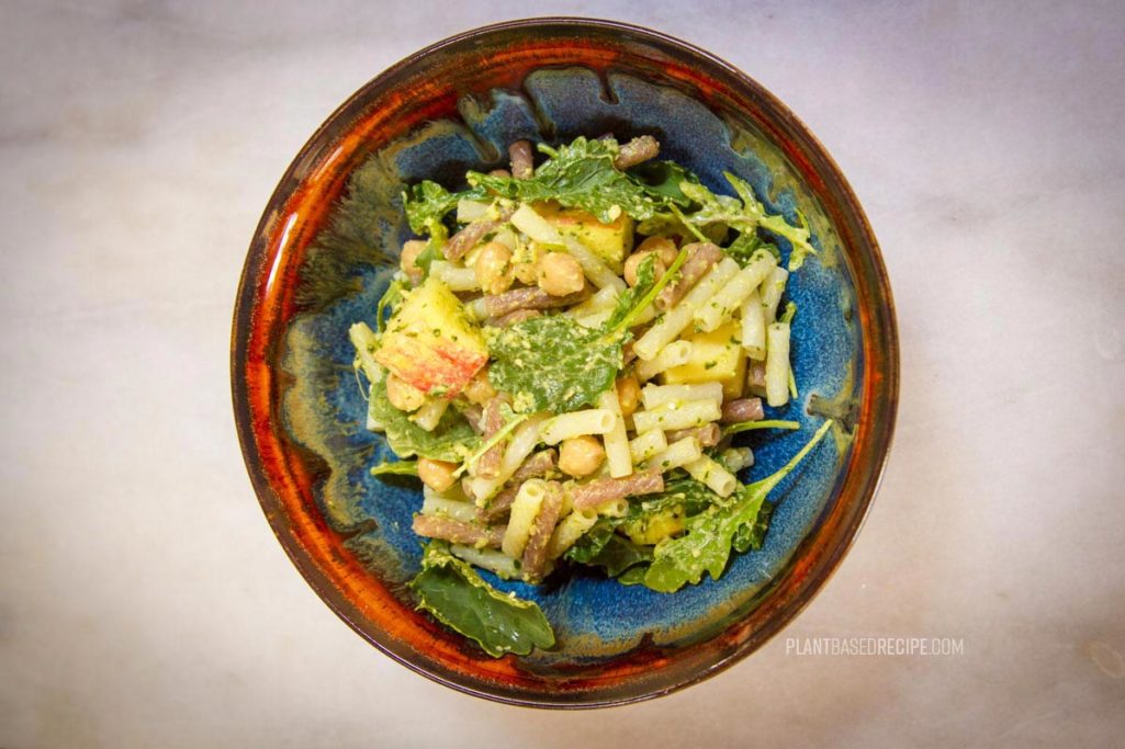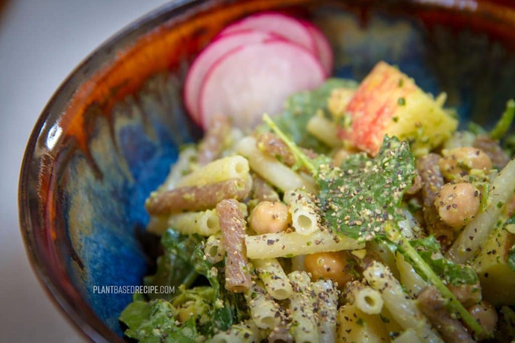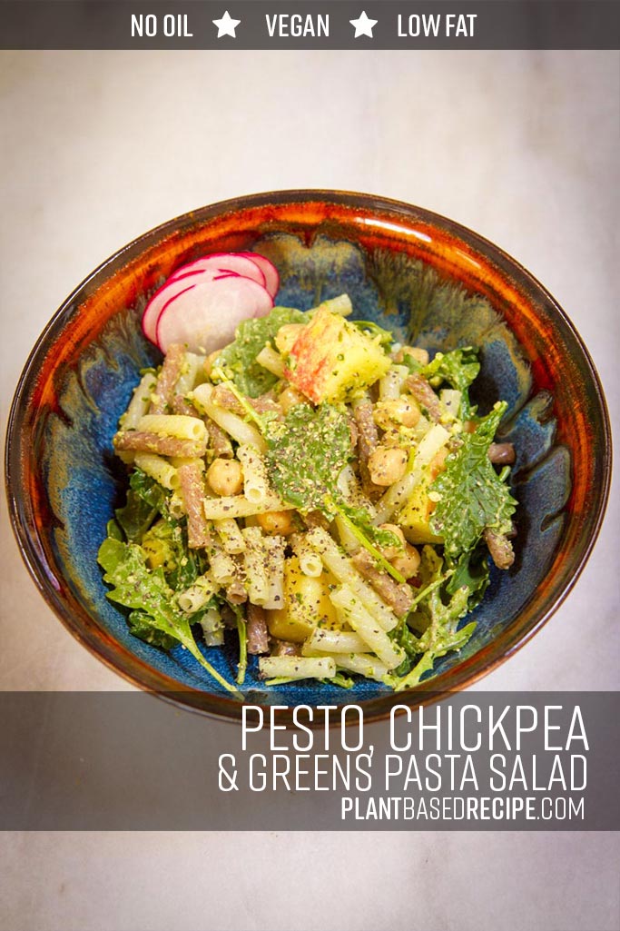 If you are searching for a refreshing and easy dish to take to a summertime party, look no further. Lunch, dinner, side dish – this one works. It’s filling, healthy, and doesn’t include any oil or significant source of fat. This oil-free pesto pasta salad includes greens, chickpeas, and even apple to create a balanced and healthful meal or side. It’s easy to adjust to whatever you have on hand, too. No arugula? Use kale. No chickpeas? Toss in some white beans or English peas.
