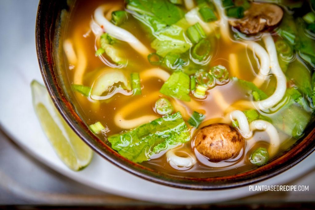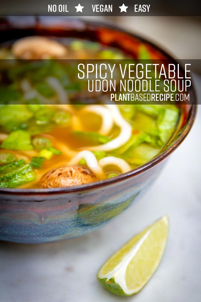 A quick lunch is often required if you’re working, whether it’s at home or in the office. This lunch of a simple vegetable udon soup fits the bill: it was prepared out of what happened to be in the fridge at the time: random vegetables (asian greens, mushrooms, and onions), vegetable broth that is always on hand (either homemade, or low-sodium from a paste), and some spice for punch. And naturally, a bit of lime. Depending on the type of noodles you find and broth you use, this can be an incredibly healthy lunch that is whole food, nutritious, and low sodium/no oil.