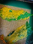 I dip one side in the flavor paste and set on the cooking rack flavor side up which saves a bit of cleaning work and more flavoring stays on the chips themselves. Using a dehydrator retains a lot of the original color of the kale, and is great during warm summer months for keeping the kitchen cool. Note that tahini is an oil-free food. You do need to check that the product you select does not have added oil in the ingredients list.